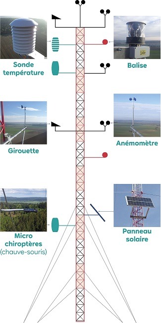 Un mât de mesure a ainsi été installé sur la zone d’implantation du projet afin de recueillir des données locales. Ce mât de mesure, d’une hauteur d’environ 106 mètres, est équipé de plusieurs types d’instruments de mesures, à différentes hauteurs : des girouettes (direction du vent) et anémomètres (vitesse du vent). Des micros à ultra-sons y sont également installés durant certaines périodes de l’année, afin de compléter les données de l’étude faune et flore sur l’activité des chauves-souris en altitude.